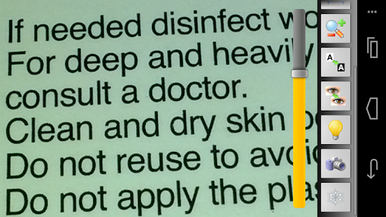 Magnifies text or anything else, with a large clear view (the quality and the zoom level of the image depends on your phone's camera). You can choose the zoom level with a slider or using your phone's volume up and down buttons, invert the image (helps nearly blind people to see text better), freeze the image, or even turn on the light (on phone's with a flash for their camera) to make it brighter.
